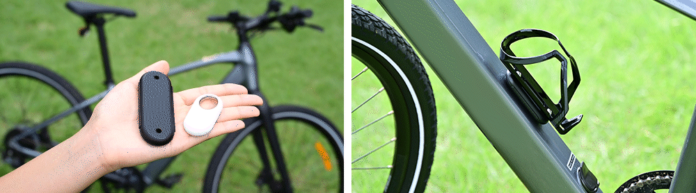 ▲(왼쪽) 보호 케이스 액세서리에 갤럭시 스마트태그2를 넣는 모습 (오른쪽) 태그를 넣은 보호 케이스를 물통 거치대와 함께 자전거에 장착해 완벽하게 숨긴 모습