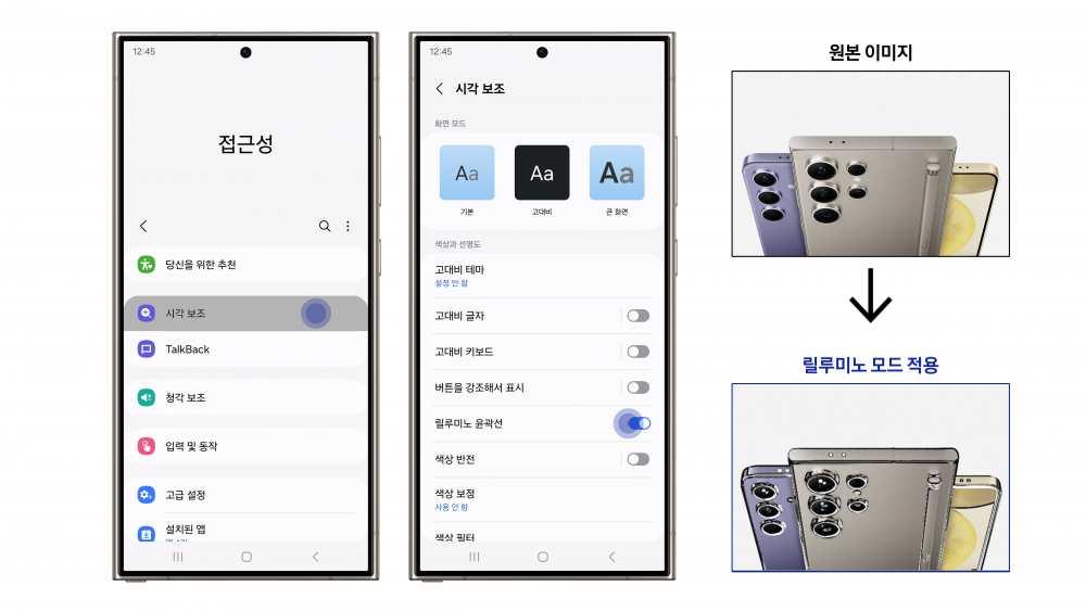 ‘릴루미노 윤곽선’ 기능은 화면의 윤곽선, 색채와 명암 대비를 강조해 스마트폰 화면 속 텍스트와 이미지의 가시성을 높여 저시력자들이 콘텐츠를 즐길 수 있도록 도움을 준다.