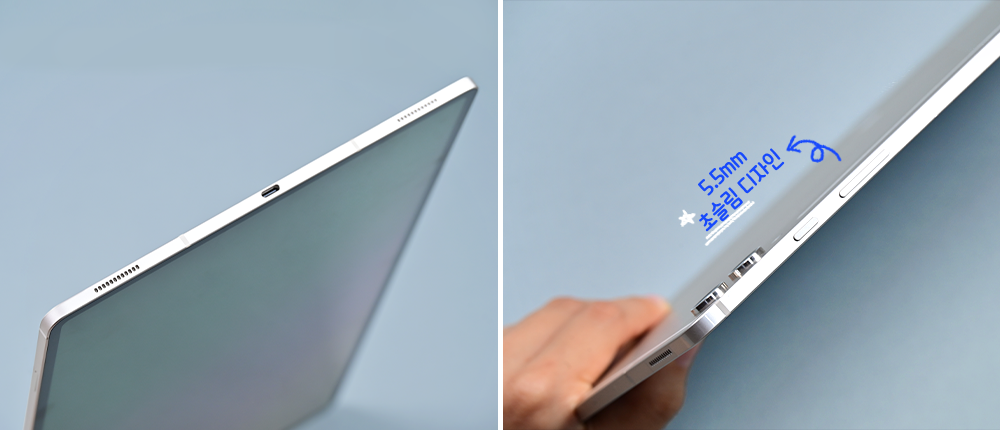 갤럭시 탭 S9 울트라는 5.5mm의 두께의 초슬림 디자인으로, 직접 잡아보니 가벼운 종이책을 들고 다니는 듯한 느낌을 준다.