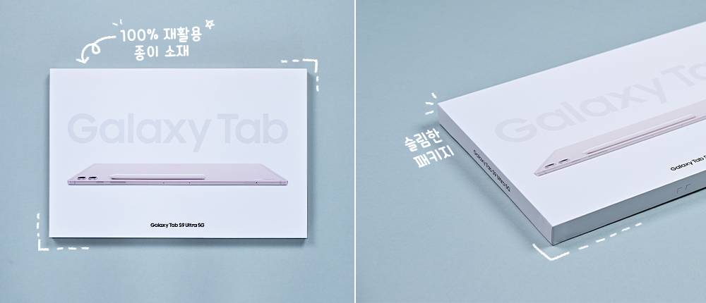 겉보기에 일반 종이와 다름없는 갤럭시 탭 S9 울트라 패키지 박스는 100% 재활용한 종이로 만들어졌다.[1] 종이도 나무를 베어 만드는 한정된 자원이기 때문. 삼성전자가 오는 2025년까지 모든 갤럭시 제품 패키지에 일회성 플라스틱을 완전히 제거하겠다는 약속이 점차 실현되고 있다는 것을 확인할 수 있었다.