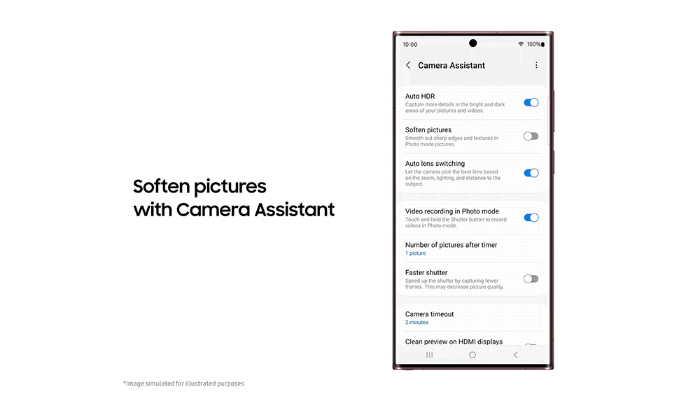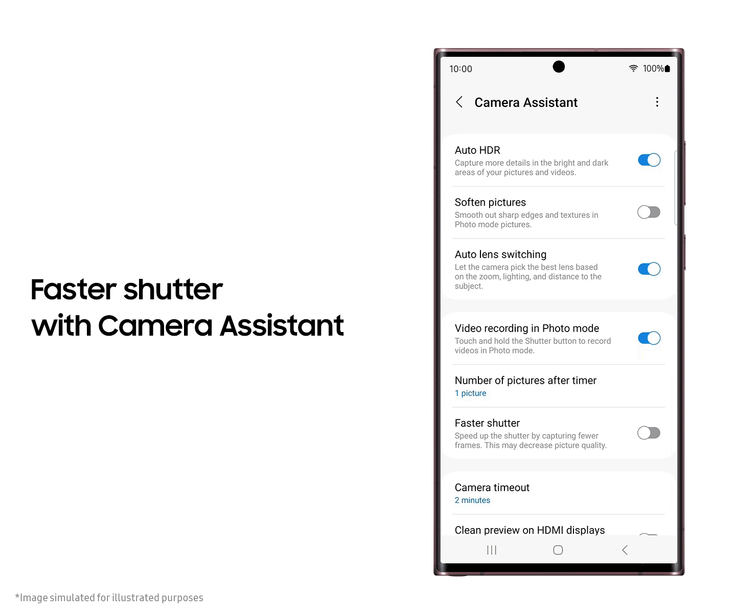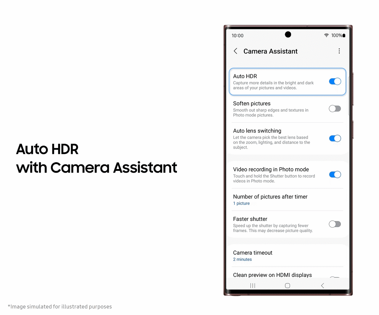 카메라 어시스턴트 앱에서는 렌즈 자동 전환, 자동 HDR, 빠른 촬영 등 특정 기능들의 활성화 여부를 선택할 수 있다. 또한, 타이머 작동 후 촬영되는 사진 개수를 선택 하는 등 다양한 촬영 옵션도 설정할 수 있다.
