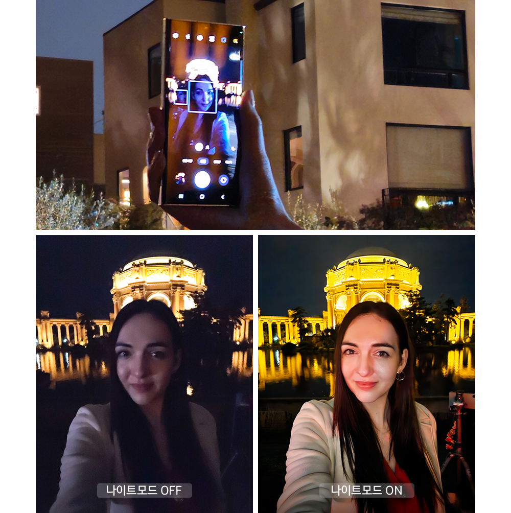 ▲ 갤럭시 S23 울트라로 어두운 곳에서 셀피 찍는 모습(위)과 나이트모드 OFF/ON 결과물 비교(아래)
