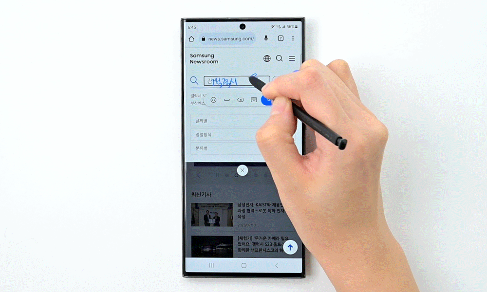 ▲ 이제 갤럭시 S23 울트라로 키패드를 켜지 않고도 쉽고 빠르게 검색이 가능해진다. 검색창에서 S펜으로 원하는 검색 내용을 쓰면, 사용자의 글씨체를 인식해 텍스트로 자동 변환해준다.