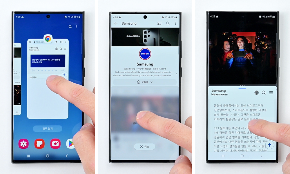 ▲ 갤럭시 S23 울트라에서는 강화된 멀티태스킹 기능을 경험할 수 있다. 화면 분할 기능을 통해 2개의 앱을 동시에 실행하거나, 노트북처럼 팝업창을 띄워 빠르고 효율적으로 업무를 할 수 있다.