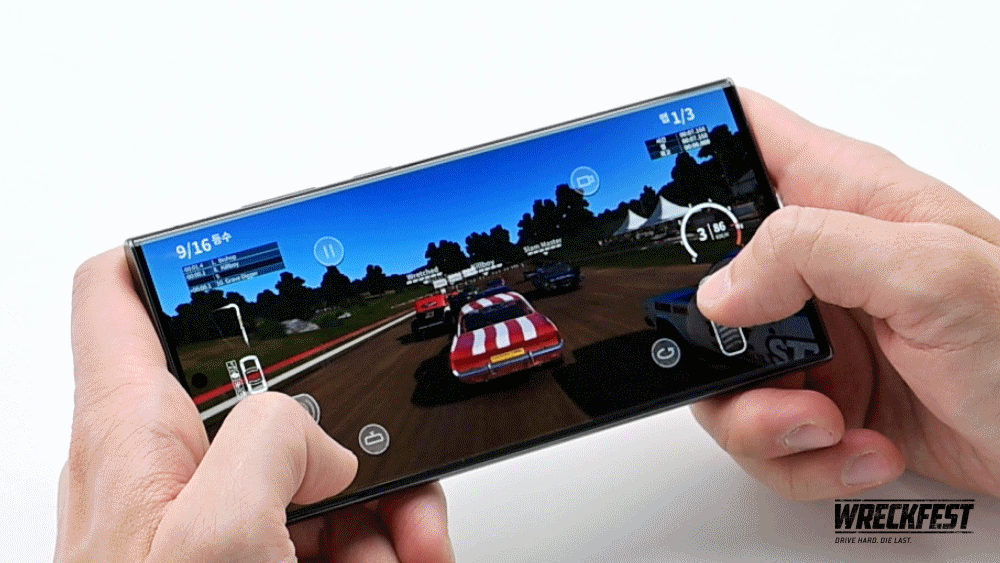 ▲ 갤럭시 S23 울트라로 극한 액션 레이싱 게임 ‘렉페스트(Wreckfest)[1]’ 를 플레이하는 모습. 갤럭시 S23 울트라는 갤럭시용 스냅드래곤® 8 2세대 모바일 플랫폼을 탑재해 빠르고 부드러운 게임 플레이가 가능하다.