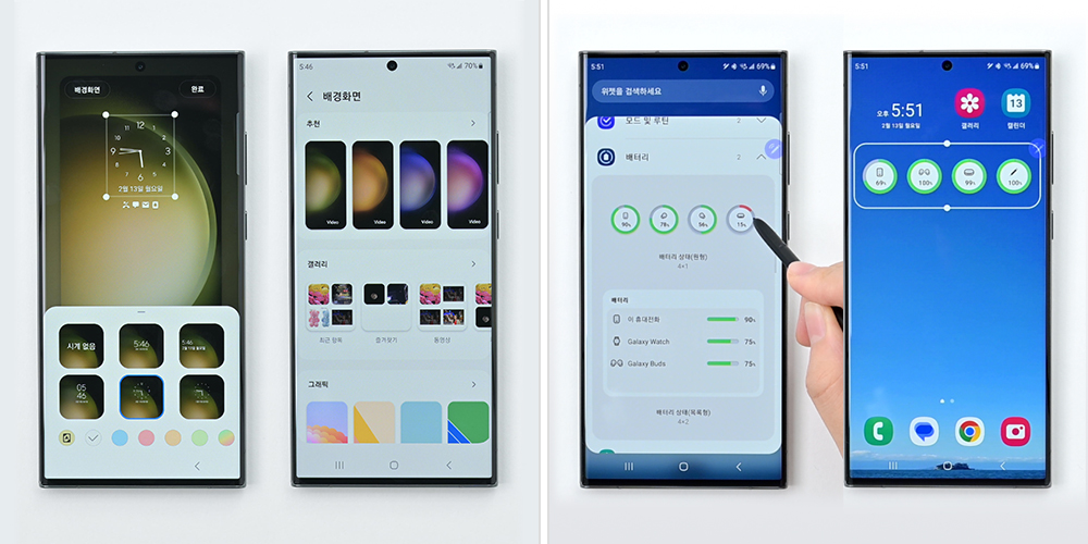 ▲ (좌) 다양한 시계 위젯과 배경 디자인을 제공하는 잠금화면 설정 화면, (우) 새로운 배터리 위젯 설정 화면