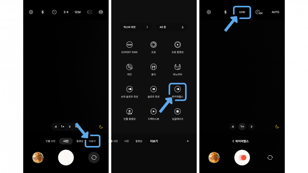 갤럭시 S23 울트라로 하이퍼랩스를 설정하는 방법은 간단하다. 카메라 실행 시 아래쪽 메뉴의 ‘더보기’에 나오는 여러 카메라 기능 중 ‘하이퍼랩스’를 누르면 촬영 준비 완료다. 이때 밤하늘처럼 먼 거리의 피사체를 고화질로 보다 선명하게 찍고 싶다면, 기본 해상도인 FHD에서 UHD로 설정을 변경하면 된다.