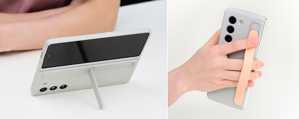 ▲ 갤럭시 Z 폴드5 스탠딩 케이스 with 스트랩은 화면 스탠드(왼쪽) 혹은 휴대성이 뛰어난 스트랩(오른쪽)으로 모두 활용할 수 있다.