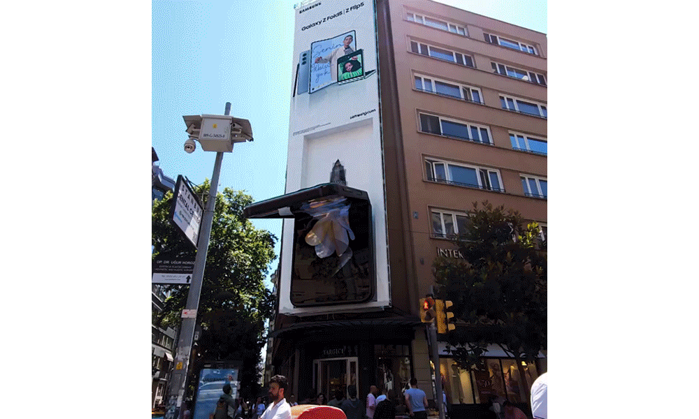 이 거대한 갤럭시 Z 플립5 · 폴드5는 사실 실제 이미지와 뛰어난 컴퓨터 합성 기술력을 결합하여 만들어진 실사 기반 가상 영상이다. 터키의 인플루언서 불루사힌과 협업하여 이스탄불에서 시작된 이 초 거대 폴더블 스마트폰은 곧 전 세계 주요 도시들에서도 펼쳐지기 시작했다. 비디오 촬영과 편집 기술, 로토스코프* 기술을 사용하여 이 거대하면서도 생동감 넘치는 갤럭시 Z 플립5 · Z 폴드5는 온라인상에서 인기를 얻고 있다.