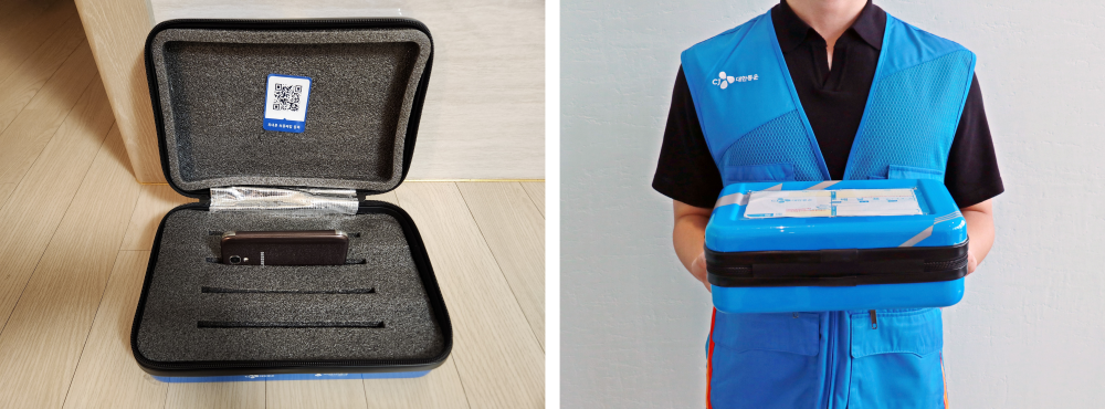 수령한 수거파우치 안에 휴대폰을 패킹하고 CJ대한통운에 패킹완료를 등록하면, 택배기사가 방문하여 수거해 간다.