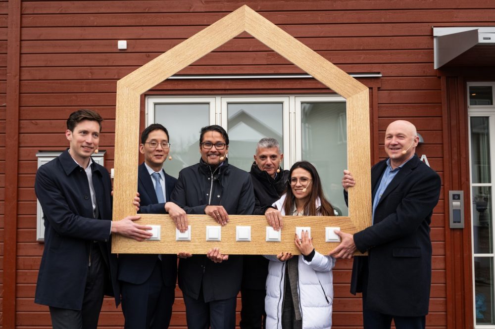 ▲ 11월 9일(현지시간) 스웨덴 브로비홀름 스마트시티 모델하우스 개관식에서 박찬우 부사장(왼쪽에서 두번째)과 관계자들이 기념 촬영을 하고 있다.