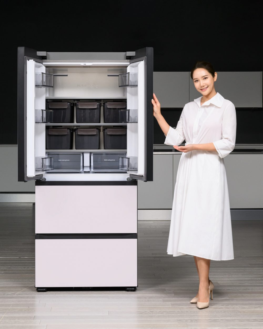 ▲삼성전자 모델이 에너지 효율성을 강화한 프리미엄 김치냉장고 ‘비스포크 김치플러스’를 소개하고 있는 모습