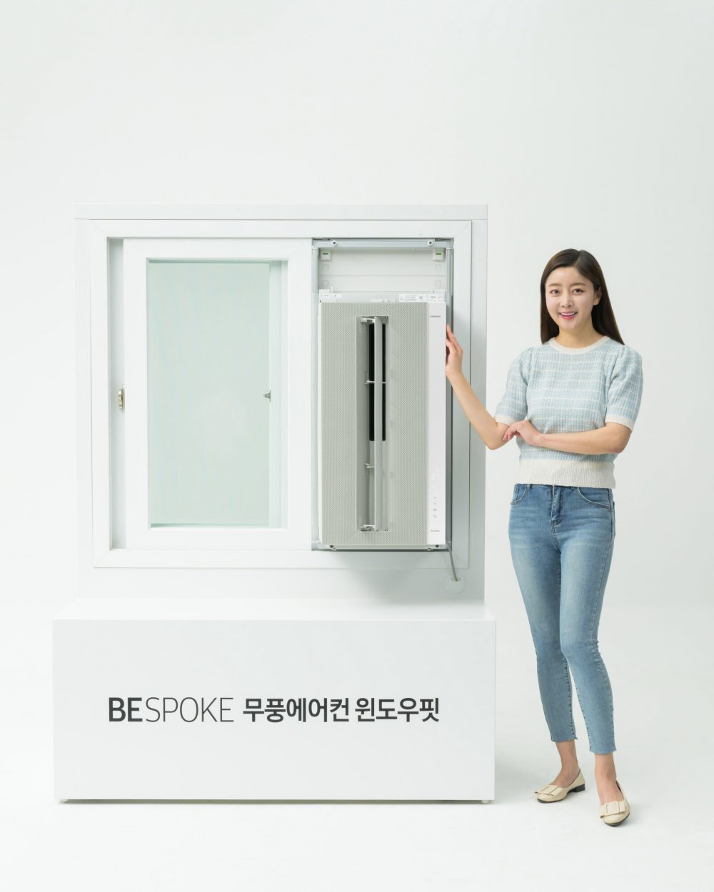 ▲삼성전자 모델이 창문형 에어컨 최초로 무풍 냉방 기능이 적용된 ‘비스포크 무풍에어컨 윈도우핏’을 소개하고 있는 모습