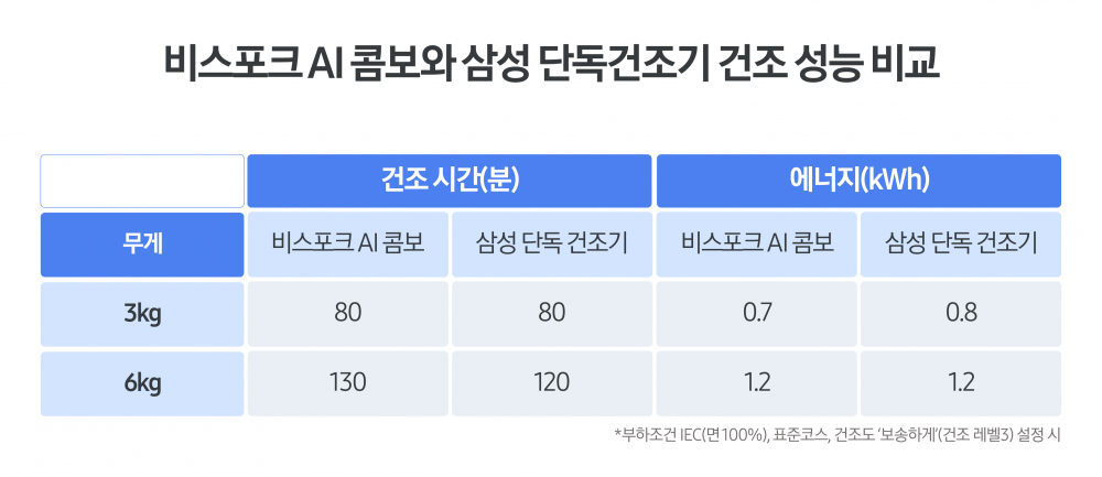 삼성전자는 비스포크 AI 콤보의 건조 성능을 국내 업계 최고 에너지 효율의 단독 건조기와 동등한 수준으로 구현했다.[4] 세탁 소비전력량과 다르게 일체형 세탁건조기의 건조 소비전력량은 의무 공표사항은 아니다.