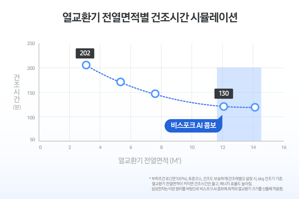 비스포크 AI 콤보의 우수한 건조 성능과 에너지 효율은 대형 열교환기를 사용했기 때문에 가능하다. 국내 일체형 세탁건조기 중 최대 크기로, 삼성전자의 21kg 용량 단독 건조기와 동일한 수준이다.