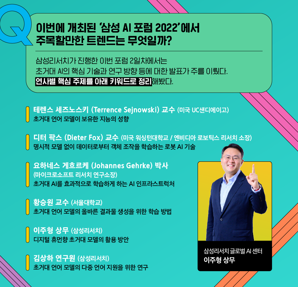 최근 다양한 미래 AI 기술에 대한 연구가 활발해지며, 실생활에서 우리 삶의 가치를 높이는 경험을 할 수 있을 것이란 기대가 커지고 있다. 삼성전자는 지난 8일과 9일, AI 연구 현황을 공유하고 발전 방향을 모색하기 위한 ‘AI 포럼 2022’를 개최했다. 세계적인 석학과 전문가가 참석한 이번 포럼에서는 특히 방대한 양의 데이터를 스스로 학습해 인간처럼 종합적 추론이 가능한 ‘초거대 AI’에 대한 관심이 높았다.