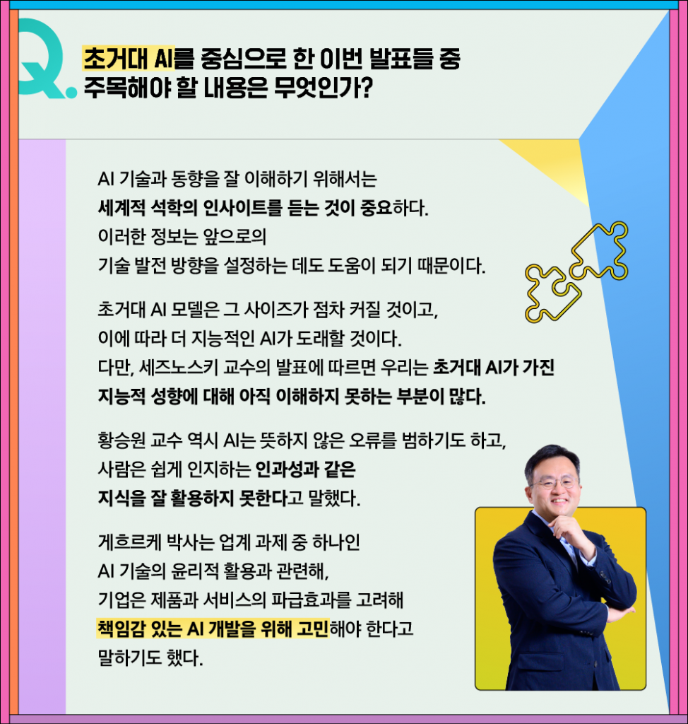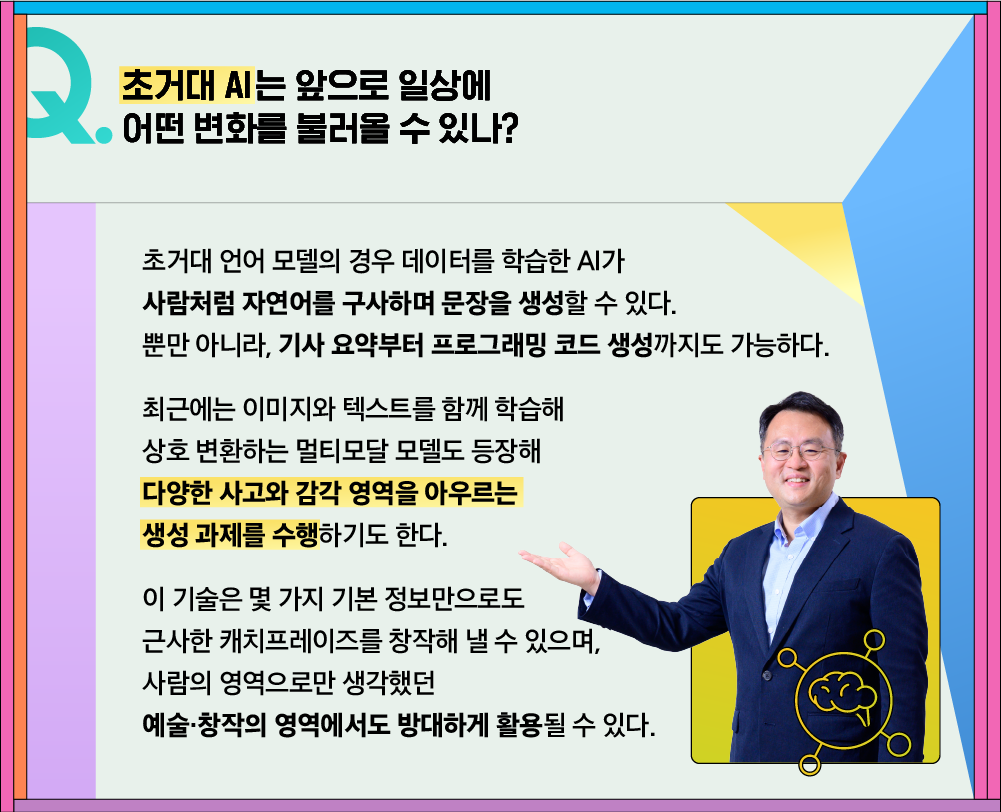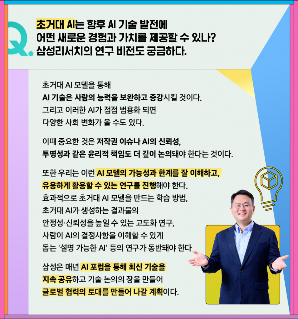 앞으로의 AI 연구 방향에 대해 듣기 위해 뉴스룸이 삼성리서치[1] 글로벌 AI 센터 이주형 상무를 만났다. 삼성리서치가 소개하는 AI 기술 트렌드와 비전을 아래 카드뉴스에서 만나보자.