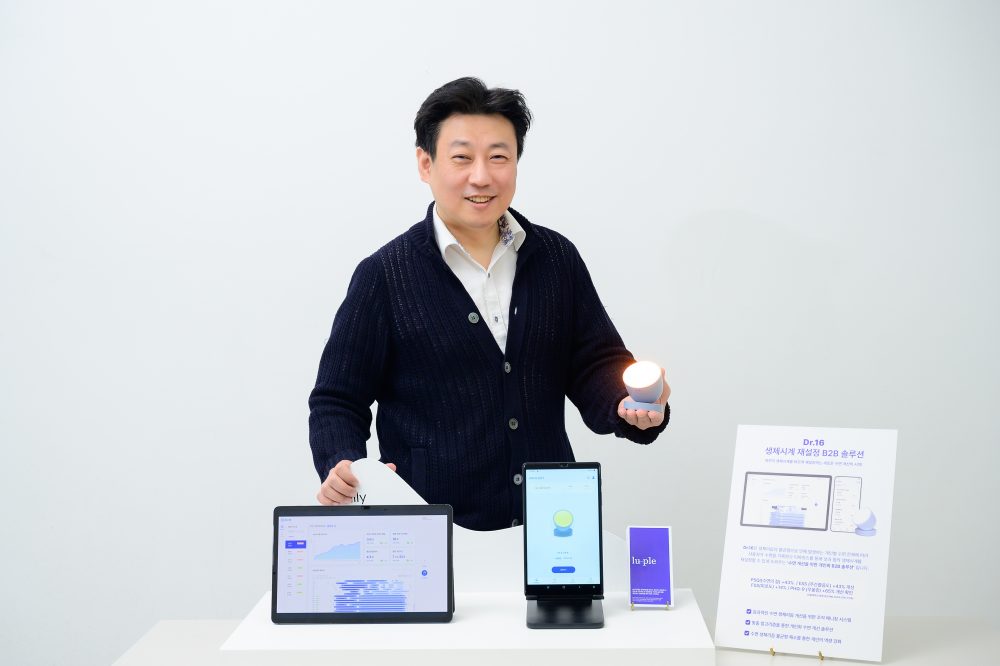 ▲ 루플 김용덕 대표가 개인용 스마트 라이트 테라피 기기 ‘올리’와 수면 개선 솔루션 ‘Dr.16’을 선보이고 있다.