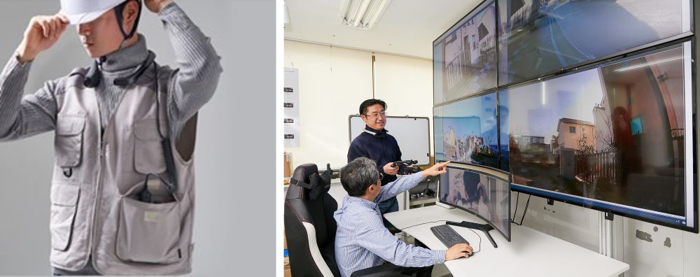 ▲ 현장 작업자가 넥밴드 웨어러블 카메라 제품을 착용한 모습(왼쪽), 현장 관제실에선 제품에서 실시간 전송된 촬영 영상을 보며 원격으로 대응할 수 있다(오른쪽).