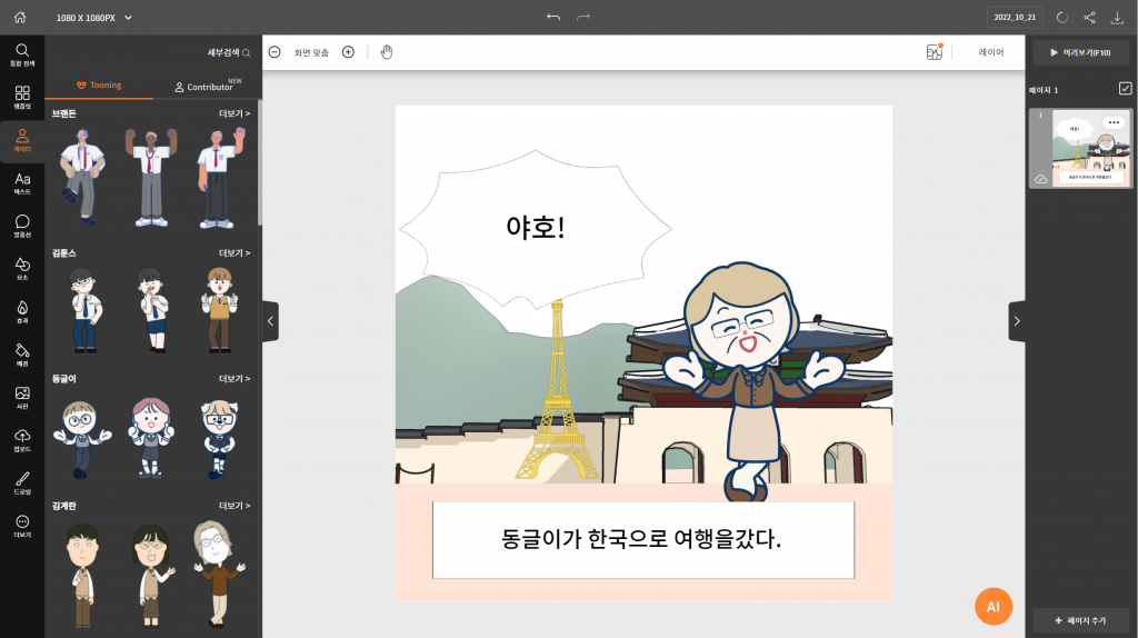 ▲(위)글을 그림으로 바꿔주는 ‘투닝’ 서비스의 ‘Text to Toon (TTT)’ AI 기능 시연, (아래) TTT 기능으로 제작된 결과물
