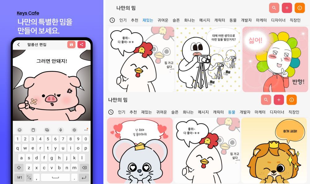 최근에는 삼성전자 MX사업부와 협업해 MZ세대를 대상으로 새로운 서비스를 제공하기도 했다. ‘갤럭시 굿락 키즈 카페’ 앱의 ‘나만의 밈’ 기능이 그것. 밈으로 소통하는 것을 즐기는 MZ세대 사용자가 앱을 통해 인기있는 밈을 자신이 원하는 대로 바꾸고 이미지로 저장해 활용할 수 있도록 했다. 툰스퀘어는 삼성에 1,000개 이상의 다양한 밈을 공급하고, 밈을 구성하는데 필요한 리소스를 받을 수 있는 API(Application Programming Interface)를 제공하고 있다. 카테고리별로 다양한 밈을 한눈에 모아보고, 상황에 맞게 튜닝할 수 있어 젊은 층을 중심으로 인기를 끌 것으로 기대된다.