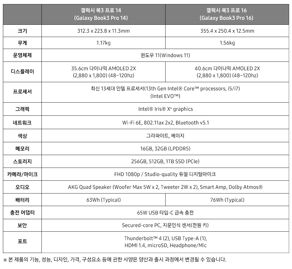 갤럭시 북3 프로 360은 40.6cm, 갤럭시 북3 프로는 35.6cm와 40.6cm 두 가지 사이즈로 출시되며, 그라파이트와 베이지의 2가지 색상을 모두 선보인다.
