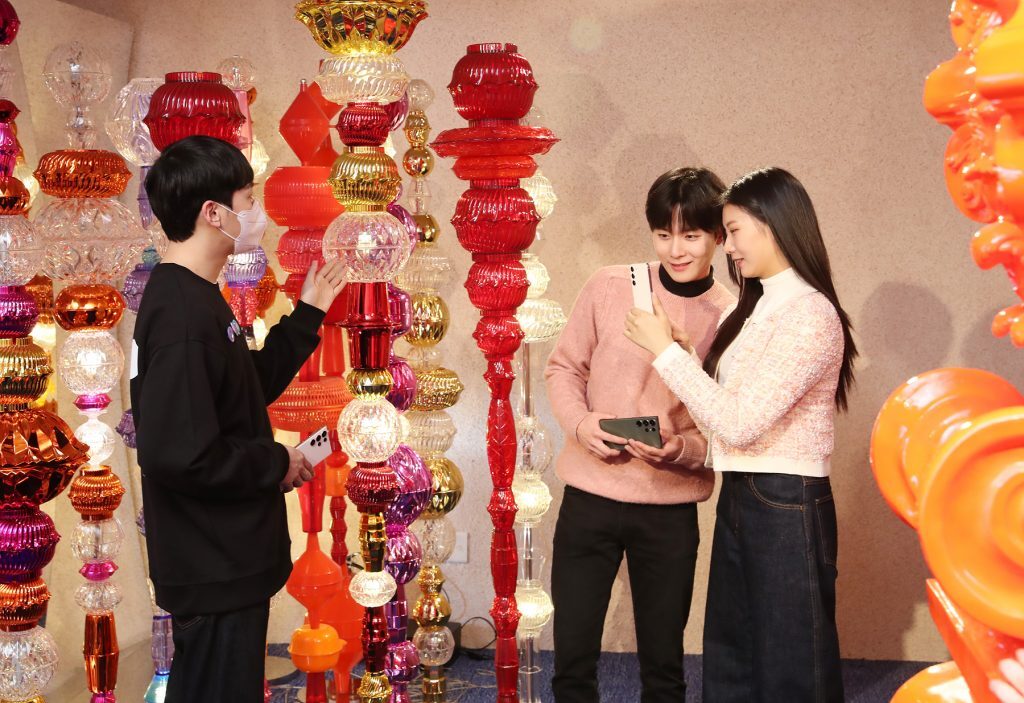 ▲ 갤럭시 스튜디오 성수에서 방문객들이 최정화 작가의 작품 ‘코스모스(Cosmos)’와 함께 ‘갤럭시 S23 울트라’로 셀피를 촬영하고 있다.