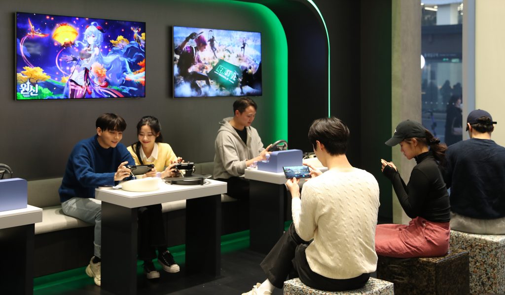 ▲ 삼성 디지털프라자 홍대본점에 마련된 갤럭시 스튜디오에서 방문객들이 ‘갤럭시 S23 시리즈’로 고사양 게임을 즐기고 있다.