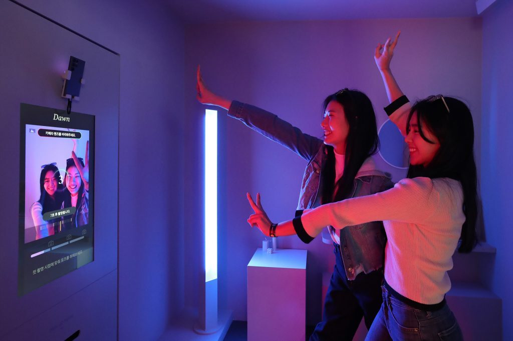 ▲ 갤럭시 스튜디오 성수에서 방문객들이 ‘갤럭시 S23 울트라’의 고성능 카메라로 감각적인 셀피를 촬영하고 있다.