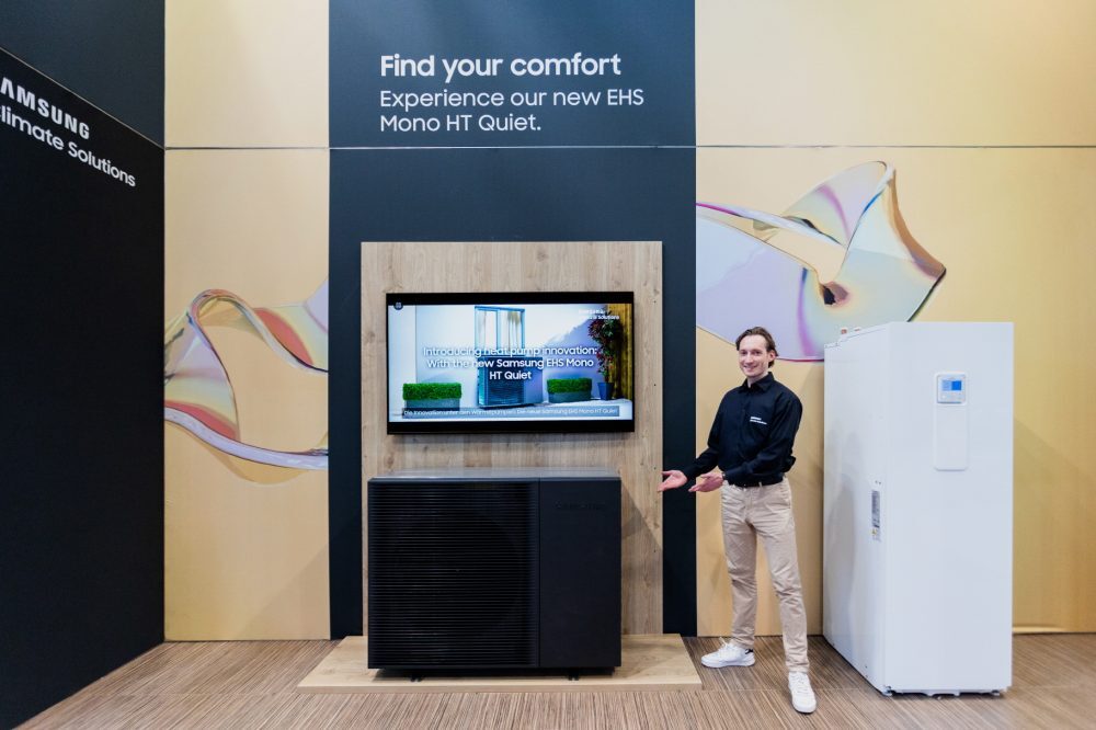 ▲ 삼성전자 모델이 13일부터 17일(현지시간)까지 독일 프랑크푸르트에서 개최되는 냉·난방공조전시회 ‘ISH 2023’에서 고효율 냉난방 시스템인 히트펌프 EHS 신제품을 소개하고 있는 모습