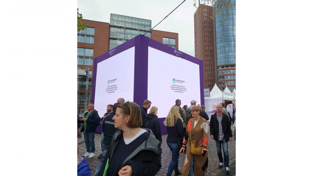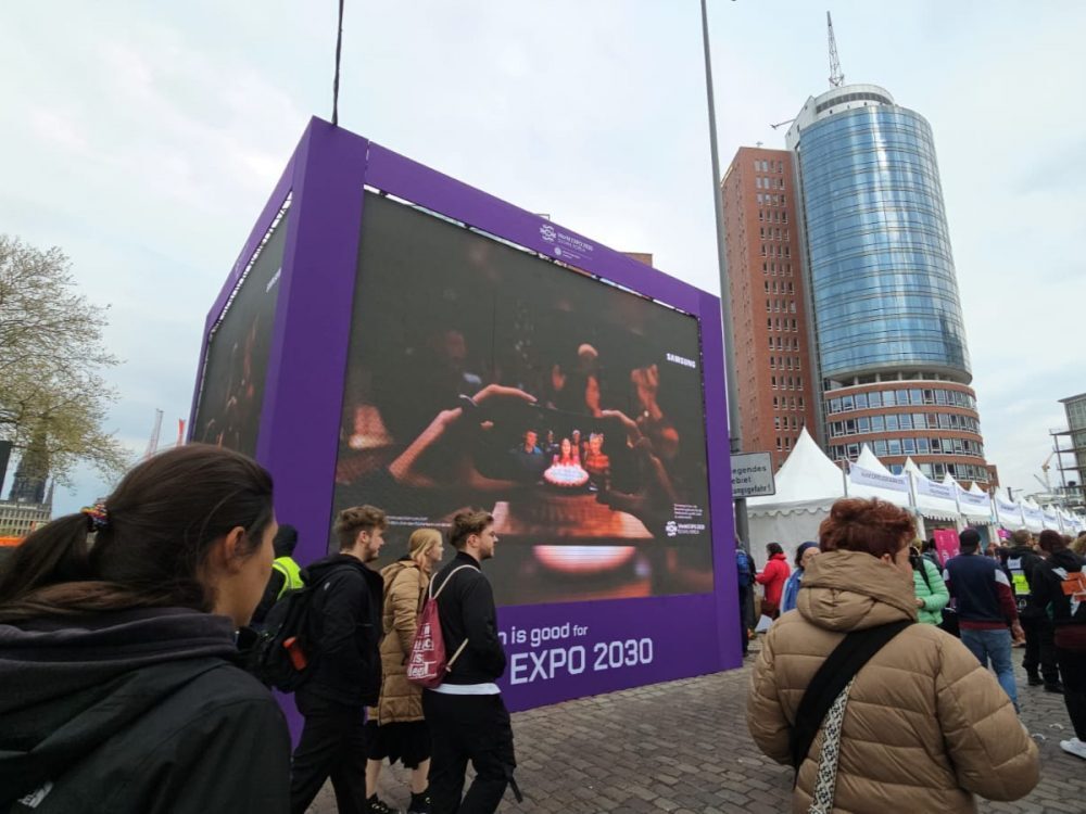 ▲삼성전자가 5일부터 7일까지 독일 함부르크에서 열린 유럽 최대 항구축제인 제834회 함부르크 개항축제에서 행사장 내 주요 거리와 공식 무대의 대형 스크린을 통해 2030 부산세계박람회 유치 활동을 홍보했다. 사진은 행사장의 대형 큐브 스크린에 부산엑스포 광고를 선보인 모습.