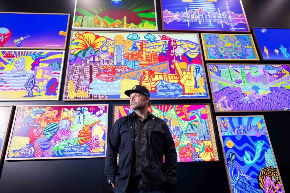 ▲ 삼성전자가 홍콩 ‘샤우트 갤러리(SHOUT Gallery)’와 협업해 라이프스타일 TV ‘더 프레임(The Frame)’을 활용한 디지털 아트 전시회 ‘더 프레임 디지털 아트 갈라(The Frame Digital Art Gala)’를 연말까지 진행한다. 전시회에 참여한 자보타주(Szabotage) 작가가 디지털 아트 작품을 소개하고 있는 모습.
