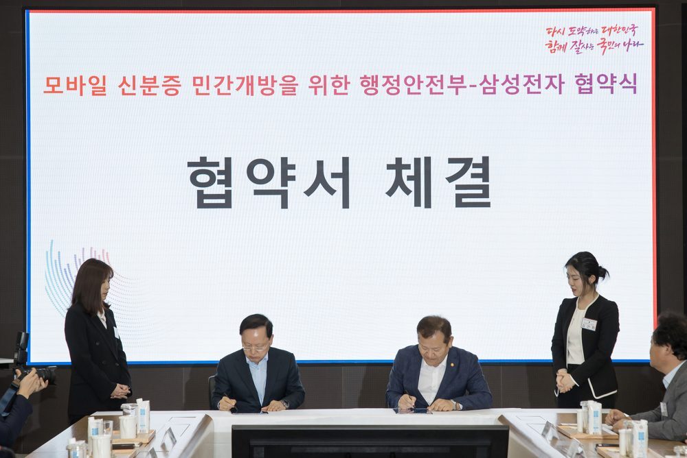 행정안전부와 삼성전자가 6일 삼성전자 평택캠퍼스에서 대한민국 정부가 제공하는 모바일 신분증 이용 활성화를 위한 업무 협약을 체결했다. 이날 협약식에는 행정안전부 이상민 장관과 삼성전자 경영지원실장 박학규사장이 참석했다. 양자는 이번 업무 협약을 통해 행정안전부가 공식 제공하는 모바일 신분증인 ‘모바일 운전면허증‘과 ‘모바일 국가보훈등록증‘을 삼성전자 갤럭시 스마트폰에 탑재하기 위한 기술 개발 협력을 약속했다.