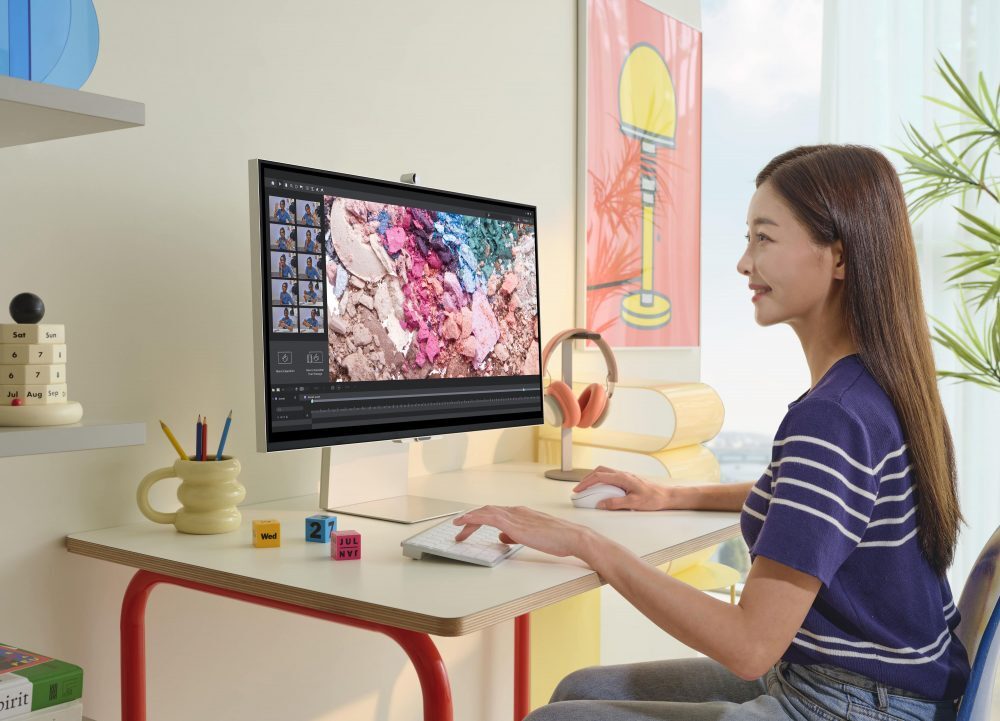 ▲ 삼성전자 모델이 그래픽 디자인용 5K 초고해상도 모니터 ‘뷰피니티 S9’을 소개하고 있는 모습