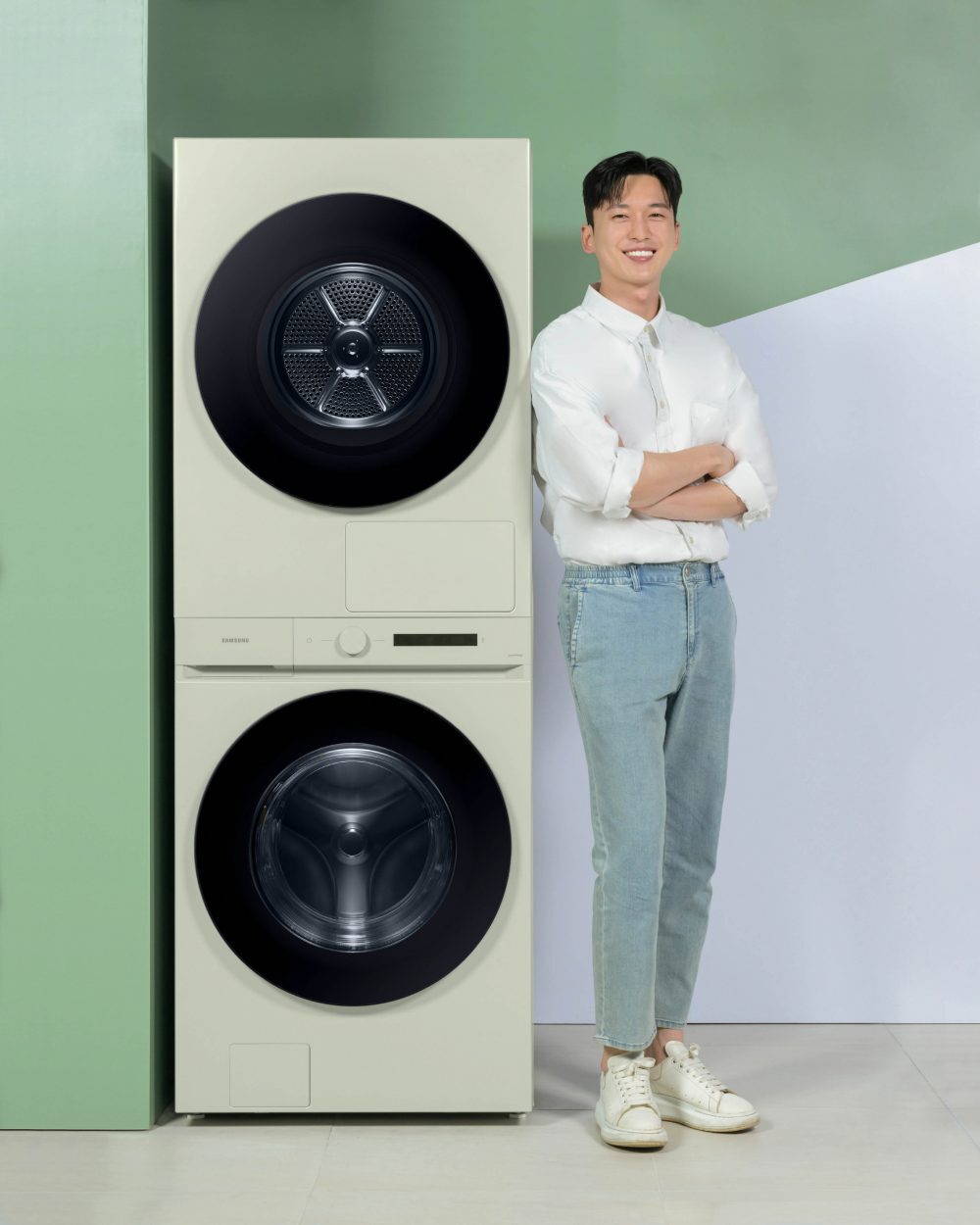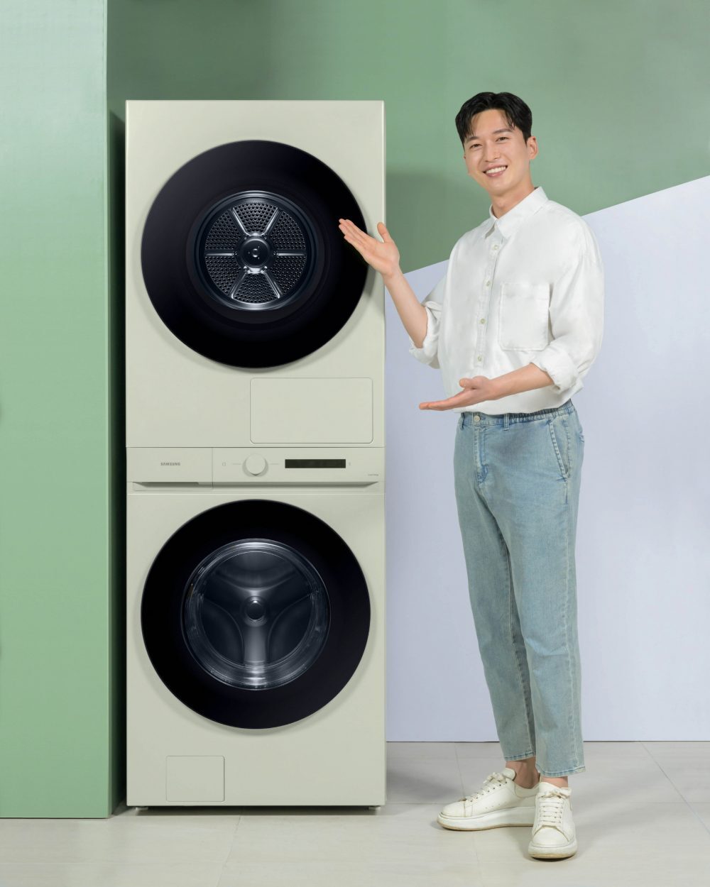 ▲ 삼성전자 모델이 제품 높이 낮춰 누구나 편하게 사용하는 ‘비스포크 그랑데 AI 원바디 Top-Fit’ 제품을 소개하고 있는 모습