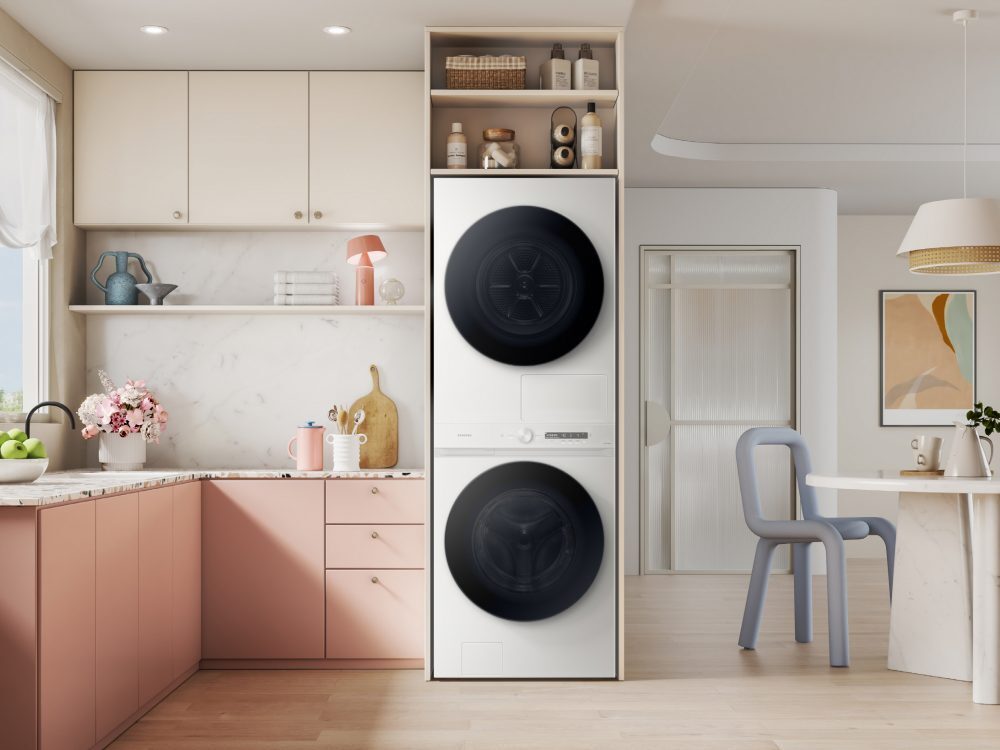 비스포크 그랑데 AI 원바디 Top-Fit은 세탁기와 건조기 상하 일체형으로, 기존 세탁기와 건조기를 직렬 설치했을 때 보다 제품 전체 높이가 낮다.
