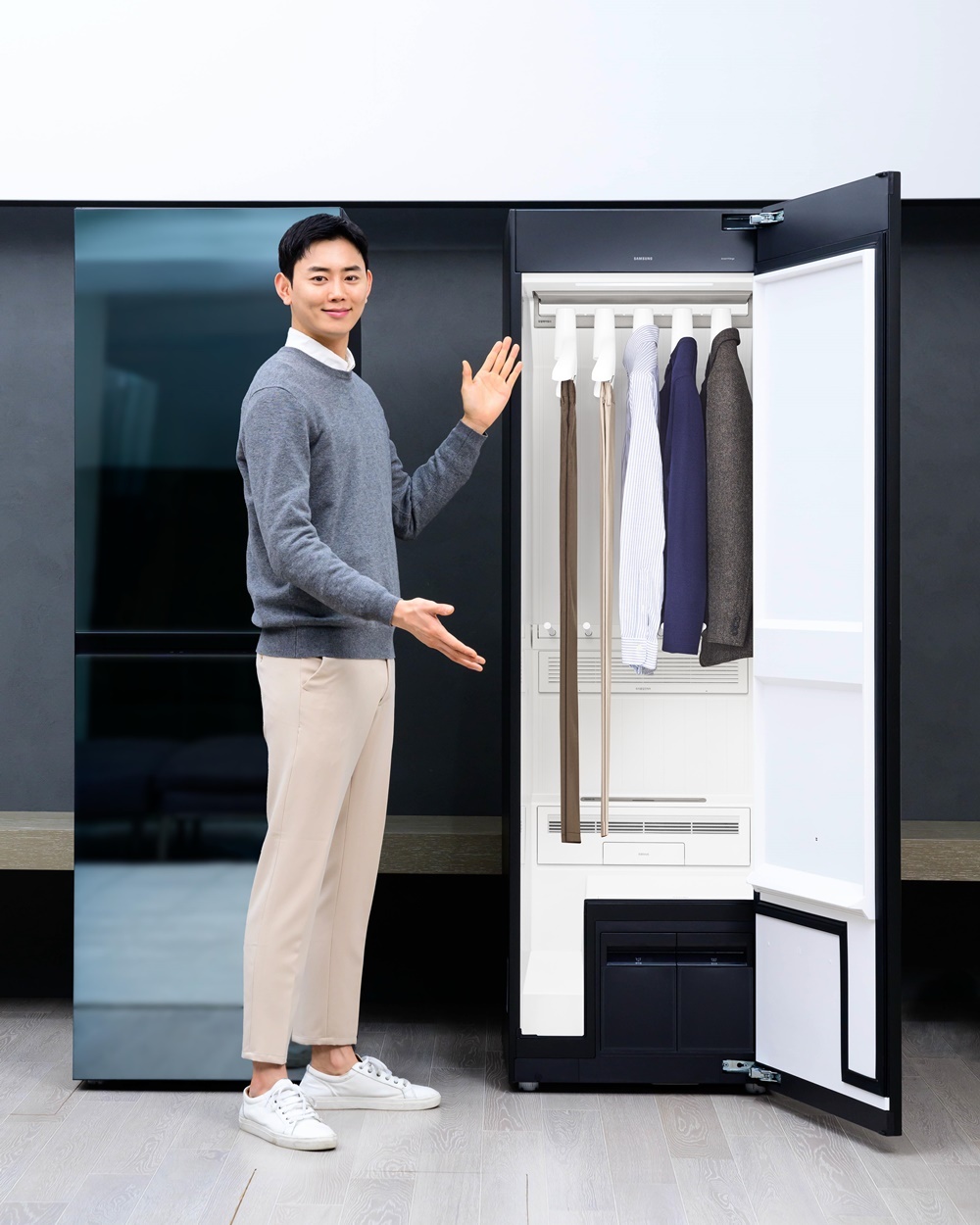 ▲ 삼성전자 모델이 제품 외관 크기는 유지하면서도 한번에 관리 가능한 의류 수를 최대 9벌로 늘린 ‘비스포크 에어드레서’ 대용량 모델 신제품을 소개하고 있는 모습