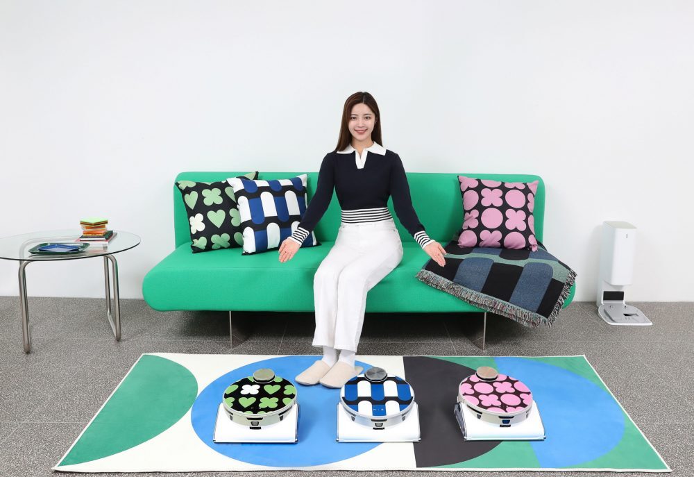 ▲ 삼성전자 모델이 패턴 디자인 브랜드 ‘드롭드롭드롭’의 인기 패턴에 시각적 접근성을 높인 ‘비스포크 제트 봇 AI’ 스페셜 에디션을 소개하고 있는 모습