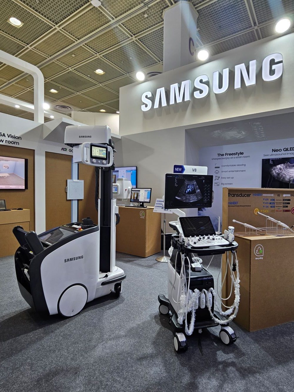 ▲ 삼성전자 부스에 전시된 프리미엄 초음파 진단기기 ‘V8′(오른쪽)과 이동형 엑스레이 ‘AccE GM85’