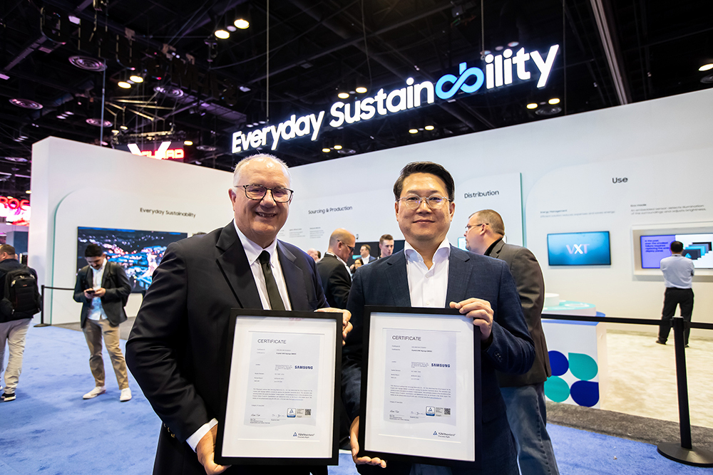 ▲ TÜV 라인란드(TÜV Rheinland) 스캇 그릭스 상무와 삼성전자 북미영업 담당 박형규 프로가 삼성전자의 신제품 2023년형 스마트 사이니지 QxC 시리즈와 더 월 올인원에 대해 탄소발자국 인증 수여식을 진행했다.
