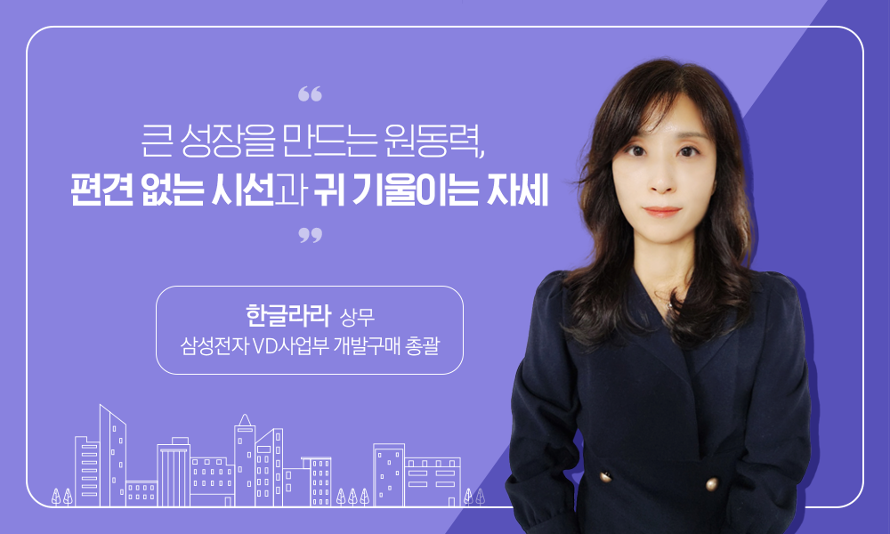 한글라라 상무는 영상 디스플레이 사업부에서 개발 부품 구매를 총괄하는 그룹장이자, 초등학생 두 아이를 키우고 있는 워킹맘이다. 한 상무는 “남성들이 육아에 참여하는 긍정적인 문화가 많이 확산됐지만 여성들은 여전히 육아로 인해 커리어를 지속적으로 쌓아가는 데 어려움을 겪고 있다. 이에, 삼성전자는 성별, 국적, 나이와 상관없이 임직원이 인정받고 성장할 수 있는 문화를 만들고자 지속 노력하고 있다.”고 설명했다.