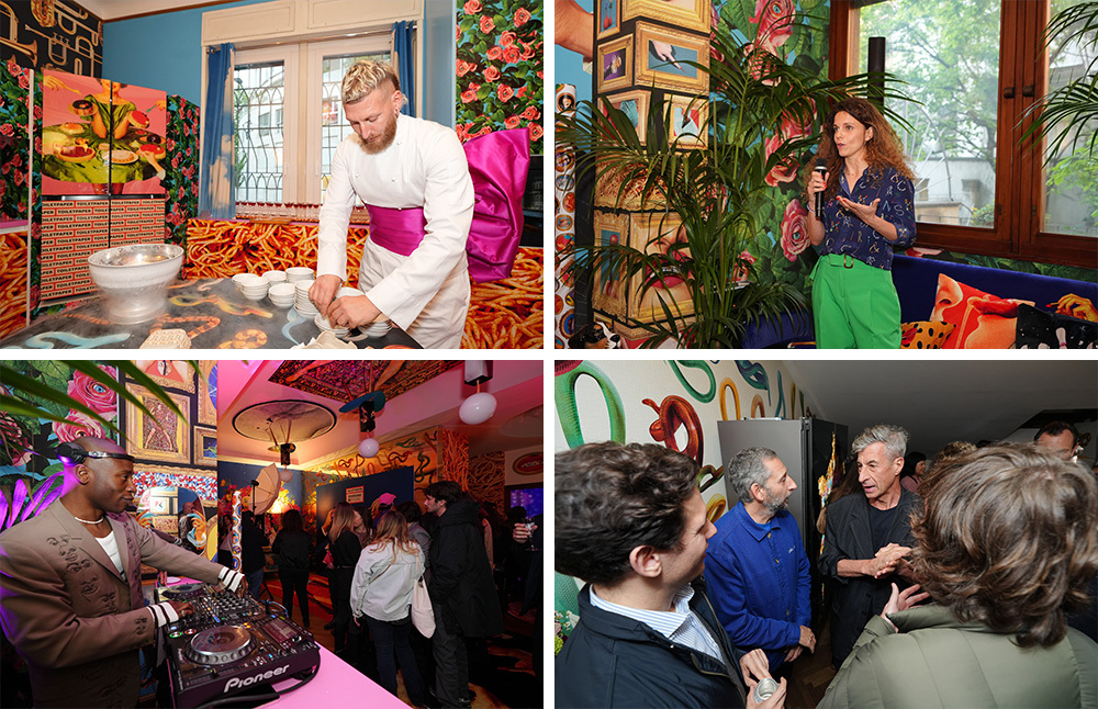 ▲ (왼쪽 상단부터 시계방향으로) 미디어 이벤트에서 이탈리아 유명 셰프인 ‘마르코 아사지야(Marco Assaggia)’가 직접 요리하는 퍼포먼스를 선보이고 있는 모습, 미디어 이벤트에서 토일렛페이퍼 아트디렉터 ‘미콜 탈소(Micol Talso)’가 이번 협업 배경과 의의에 대해 설명하고 있는 모습, 인플루언서 이벤트에서 토일렛페이퍼 창립자 마우리치오 카텔란(Maurizio Cattelans)이 참석자들과 대화를 나누고 있는 모습, 20일 저녁에 열린 ‘The Fridge Party’