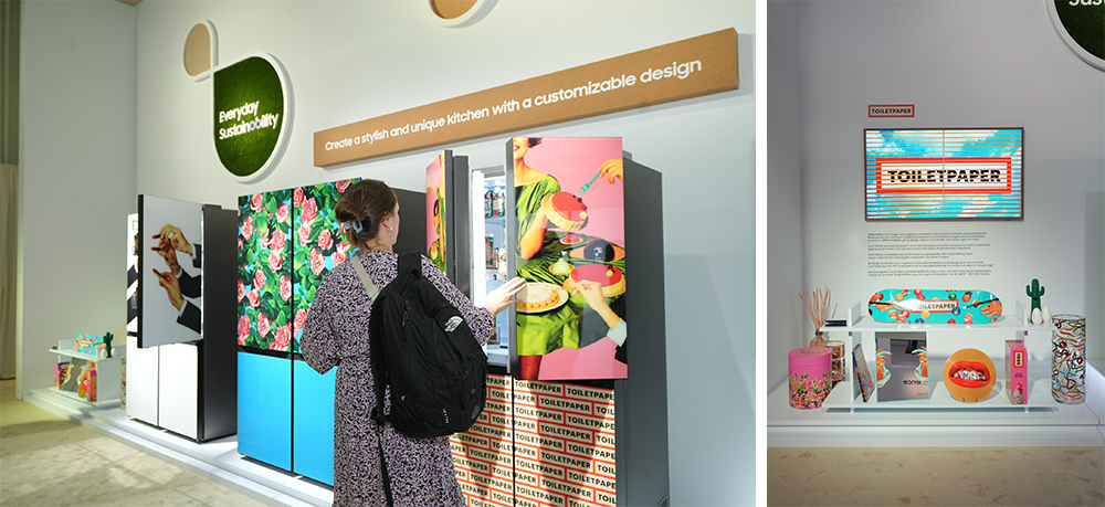 먼저 푸오리살로네 삼성전자 부스에는 협업한 한정판 냉장고 패널과 함께 토일렛페이퍼의 다양한 소품이 전시됐다.
