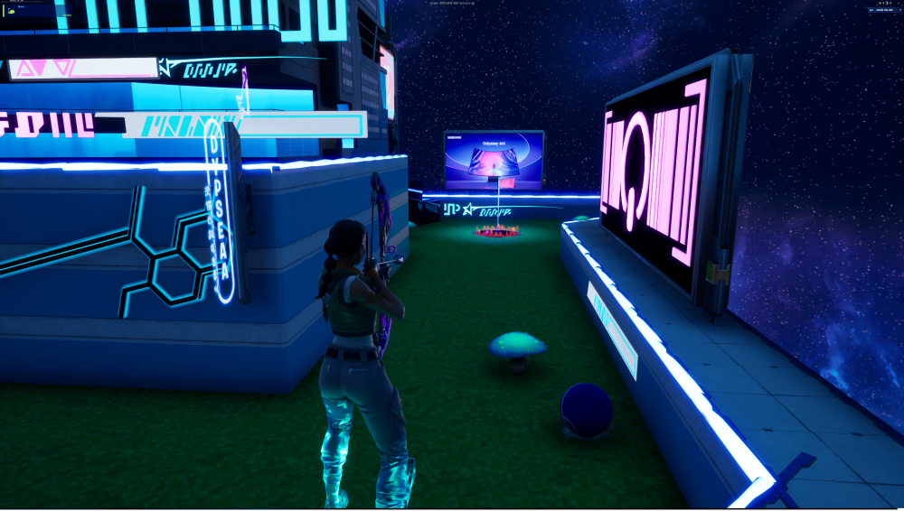 ▲ 포트나이트 ‘오디세이 유니버스’맵 접속 후 등장하는 로비. 오디세이 제품명에 맞춰 구성된 5개의 공간이 인상적이다.