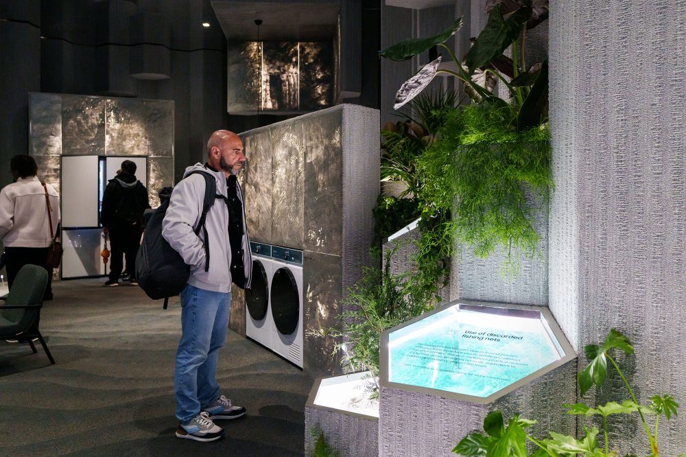 ▲삼성전자 ‘푸오리살로네 2023’ 전시장의 관람객이 공간디자이너 문승지와 협업한 ‘We Breathe’존을 둘러보고 있다. 폐어망, 재생플라스틱 레진 등을 활용해 구성한 전시장에서 삼성전자의 지속가능성을 위한 노력을 확인할 수 있다.