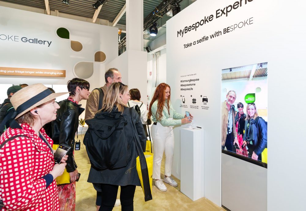 ▲삼성전자 ‘푸오리살로네 2023’ 전시장을 찾은 관람객들이 원하는 디자인의 비스포크 냉장고 패널을 제작할 수 있는 ‘마이비스포크(MyBespoke)’ 기능을 체험해보고 있다.