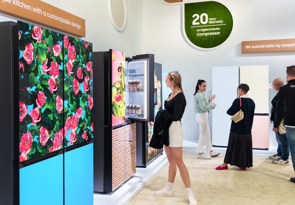 ▲삼성전자 ‘푸오리살로네 2023’ 전시장을 찾은 관람객이 ‘비스포크 냉장고 패밀리허브 플러스’ 등 초연결성을 경험할 수 있는 비스포크 가전들을 관람하고 있다.