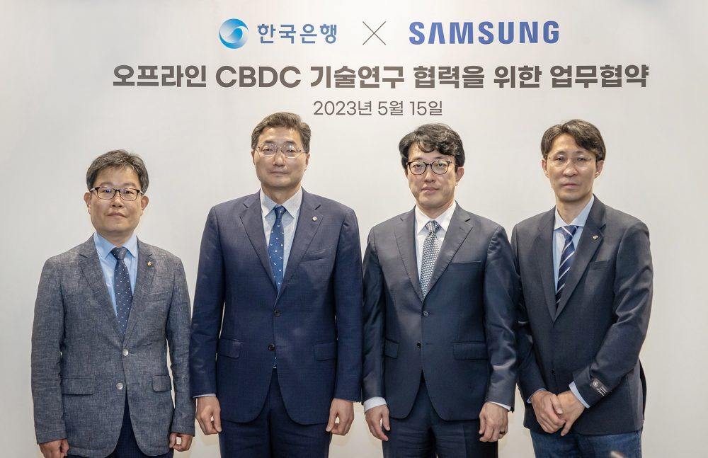 삼성전자와 한국은행이 15일 삼성전자 수원 디지털시티에서 오프라인 CBDC(중앙은행디지털화폐, Central Bank Digital Currency) 기술연구 협력을 위한 업무 협약을 체결했다. 이날 협약식에는 한국은행 이승헌 부총재와 삼성전자 MX사업부 개발실장 최원준 부사장이 참석했다.