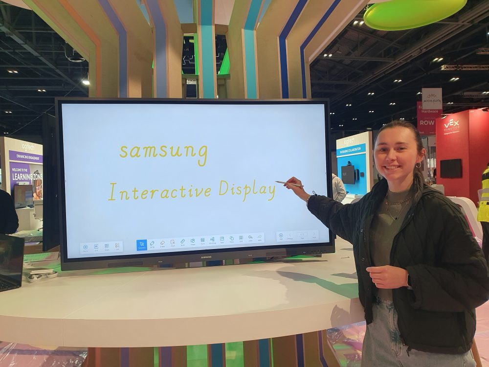 ▲ 삼성전자 직원이 영국 런던에서 열리는 유럽 최대 교육 기술 전시회 ‘Bett 2023’ 삼성전자 부스에서 신제품 전자칠판 WAC를 소개하고 있다.