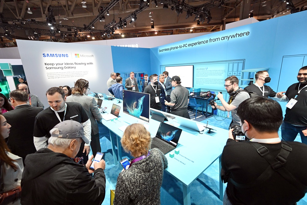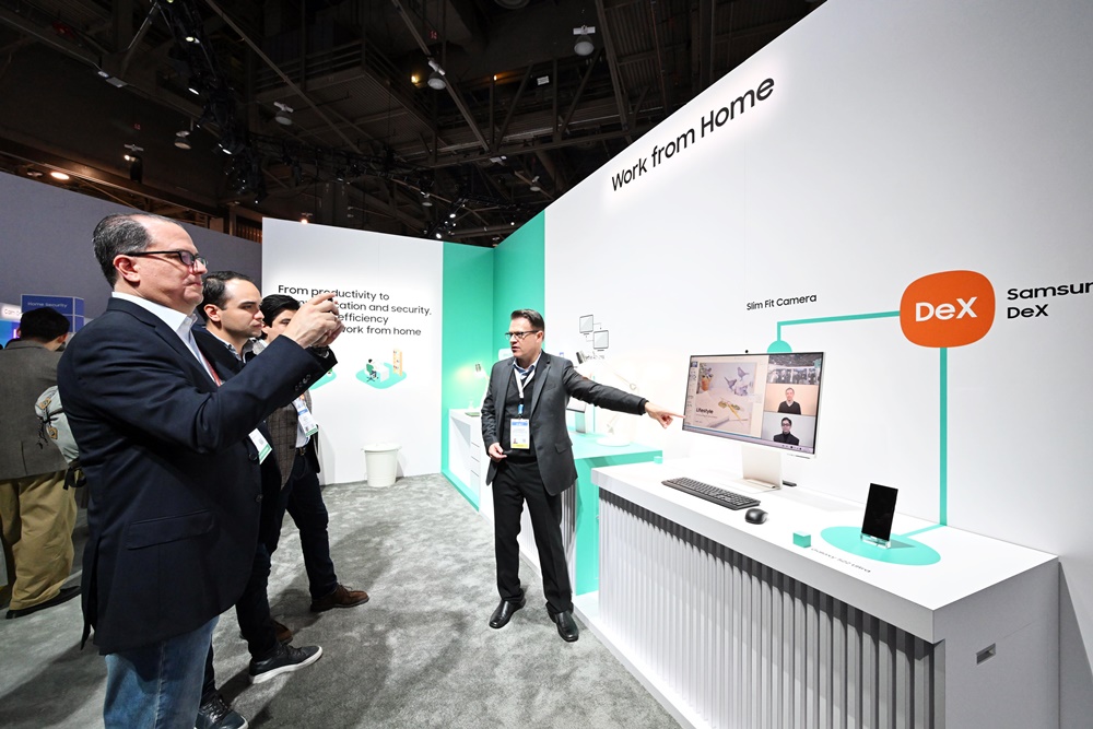 ▲ 삼성전자 전시관 ‘스마트 워크(Smart Work)’ 부스를 방문한 관람객들이 모바일과 스마트 모니터를 통해 보다 편리하게 화상회의를 할 수 있는 기능을 체험하고 있다.